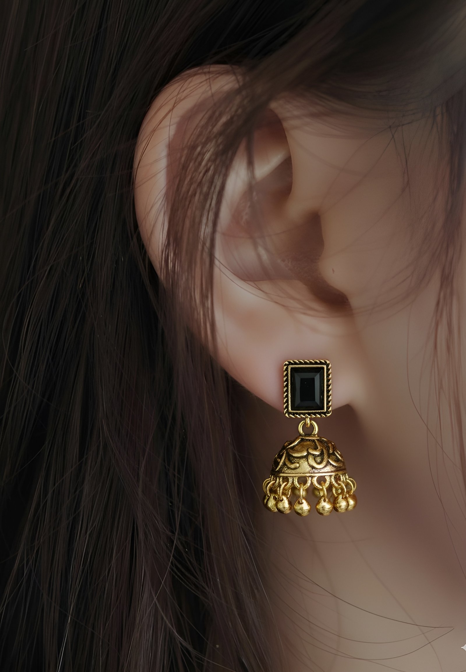 ANISA, earrings inspired by the mysterious allure of the perfect sophisticated companion. Crafted with gold-toned metal and striking black glass accents, this piece is a celebration of powerful elegance — between sophisticated authority and mysterious charm, between professional confidence and luxurious refinement. The intricate filigree work flows into bold black stones that command attention with every graceful turn. Authoritative, alluring, and regally poised, ANISA is designed to distinguish with you — whether you’re commanding boardrooms or captivating at luxury evening gatherings.