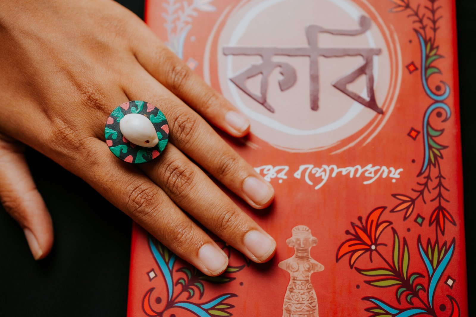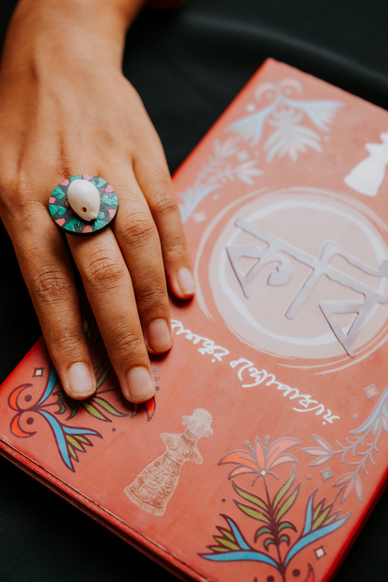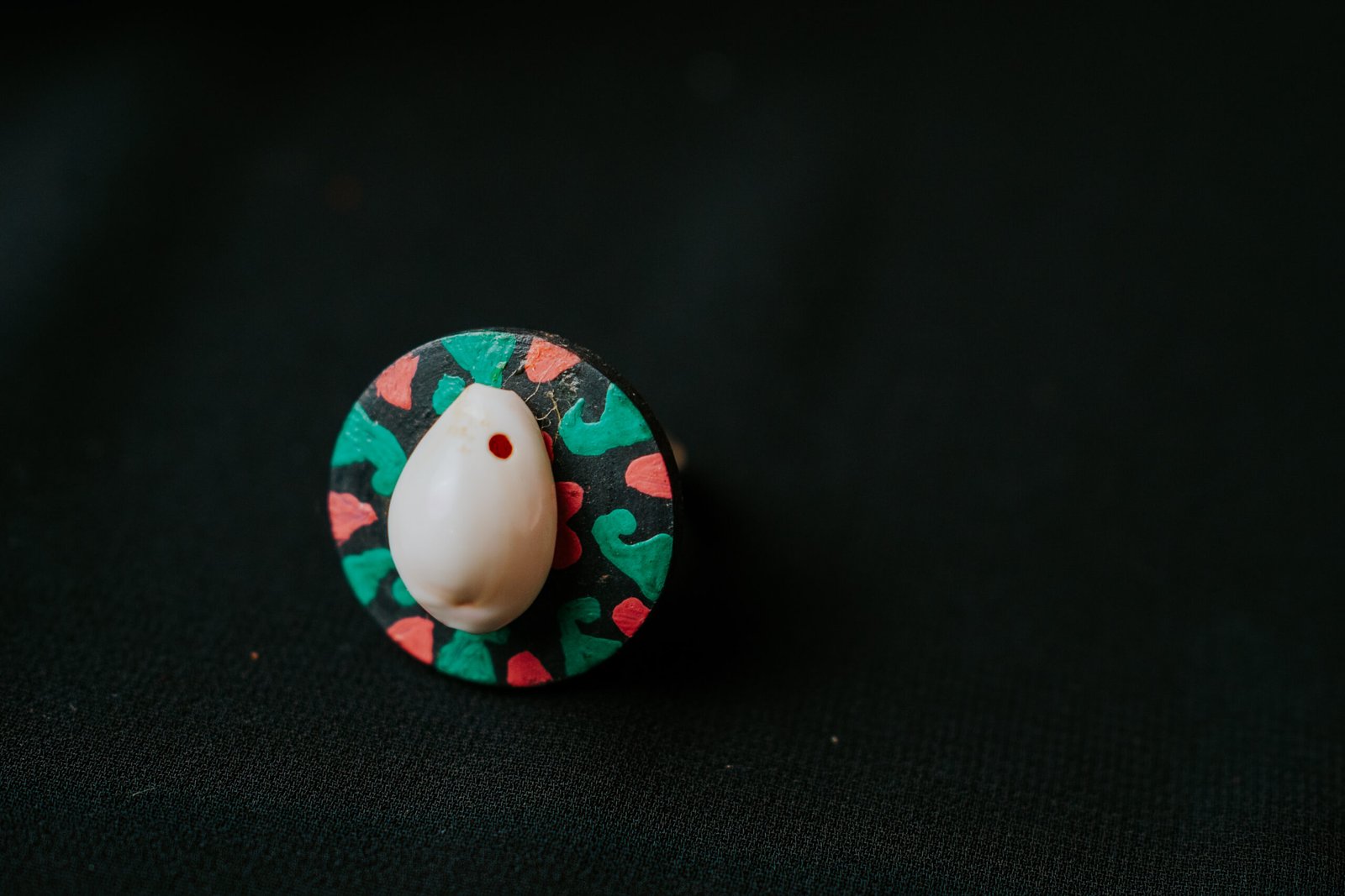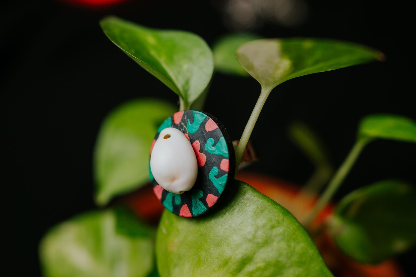 OAKI, this stunning piece showcases a luminous cowrie centerpiece surrounded by vibrant painted patterns that dance across sustainable wood — like wearing a piece of enchanted woodland art. Bold colors meet organic textures in perfect harmony, creating a ring that’s as unique as the woman who wears it.
