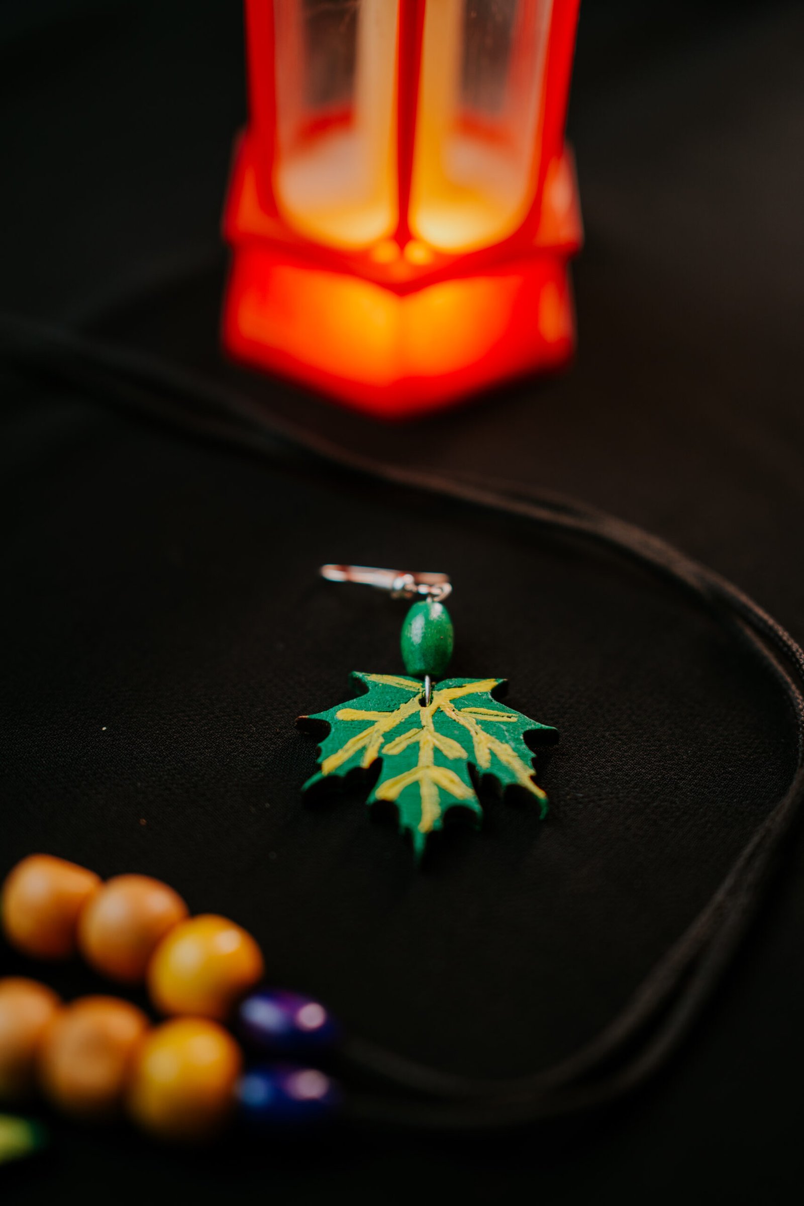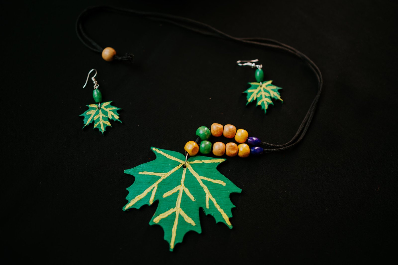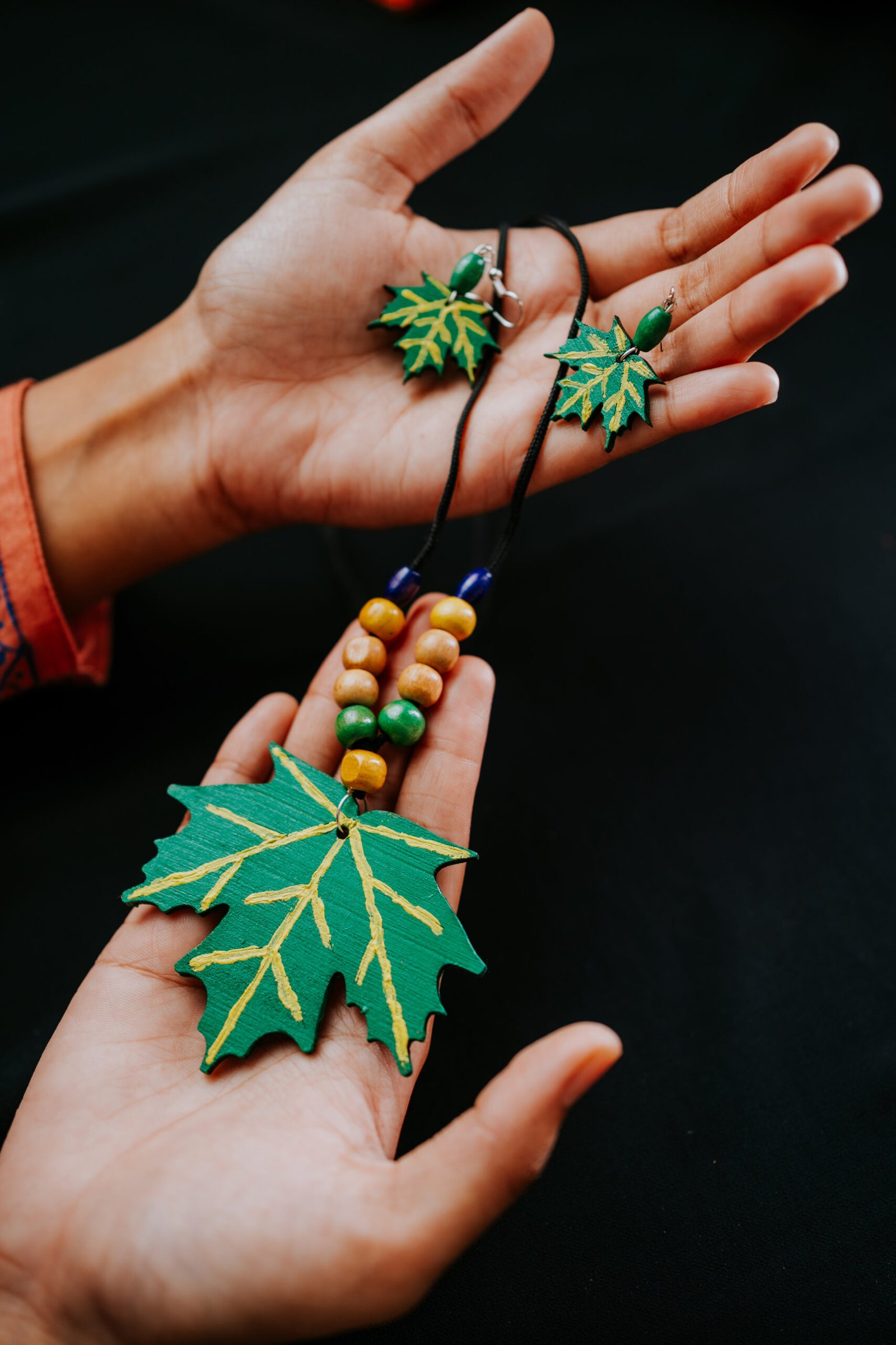 The carved maple leaf pendant and matching earrings showcase intricate golden veining that mirrors nature’s own artistry, complemented by warm wooden beads that ground you in earth’s timeless wisdom. Lightweight yet commanding attention, RHEA is designed to make a statement — whether you’re embracing new beginnings or celebrating your journey of growth.